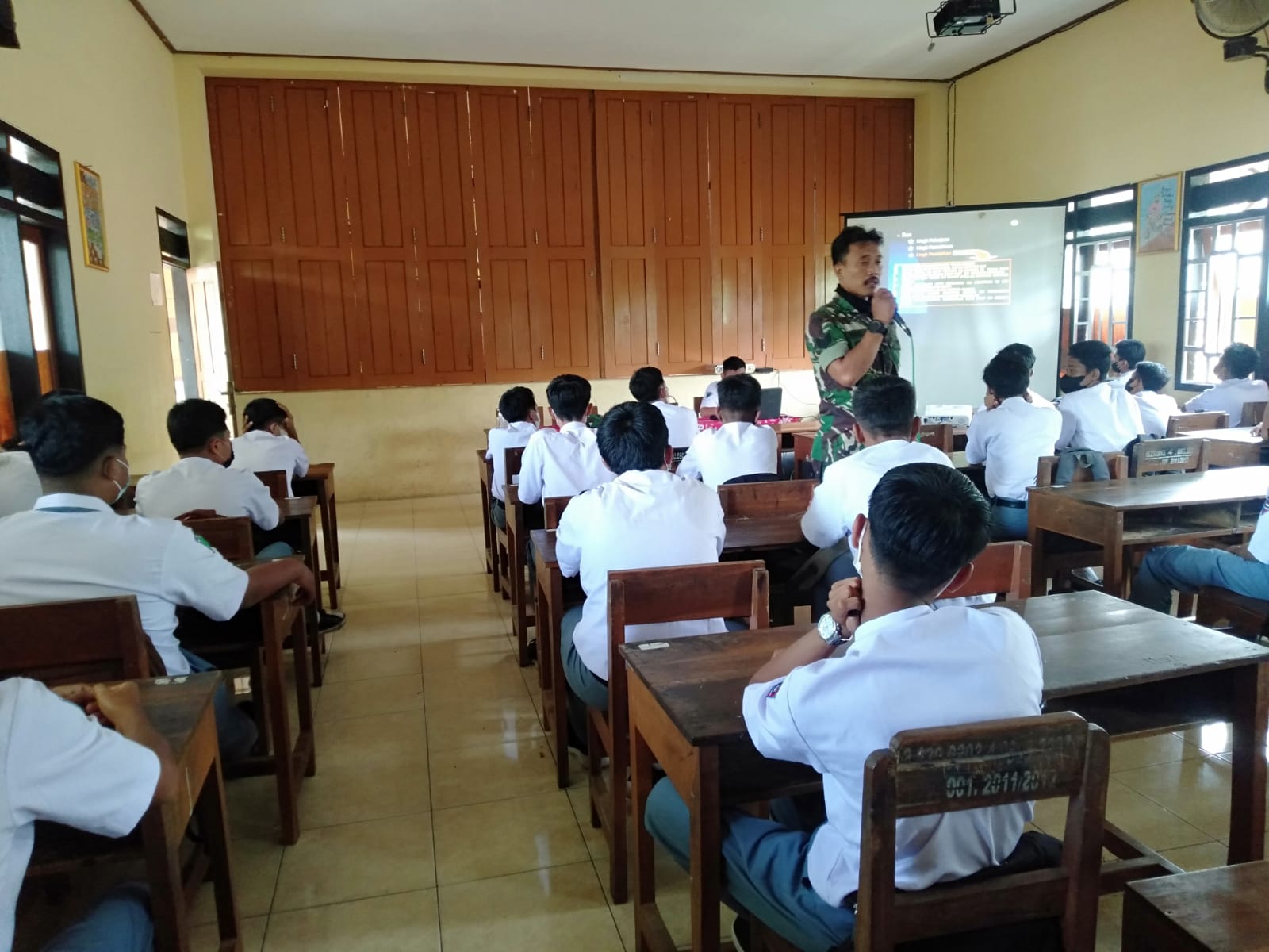 Wonogiri – Dalam rangka menumbuhkembangkan rasa cinta tanah air terhadap bangsa dan negara, Babinsa Koramil 14/Jatisrono Serma Ruslan dan Sertu Lasto memberikan pelatihan dan pembekalan di SMK 2 Pancasila Jatisrono, Rabu(15/12).