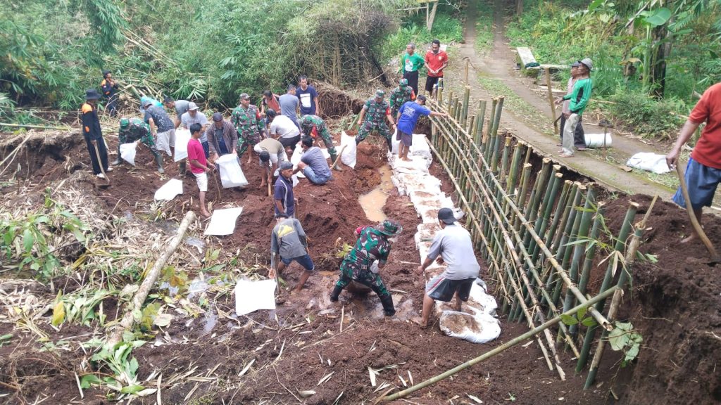 Senin(6/3/23), Sebagai upaya untuk mengantisipasi dampak kerusakan yang lebih parah, anggota Koramil 22/Slogohimo yang dipimpin oleh BatiTuud Peltu Ochsan, melaksanakan pembuatan talud bersama dengan relawan dan warga masyarakat sekitar.