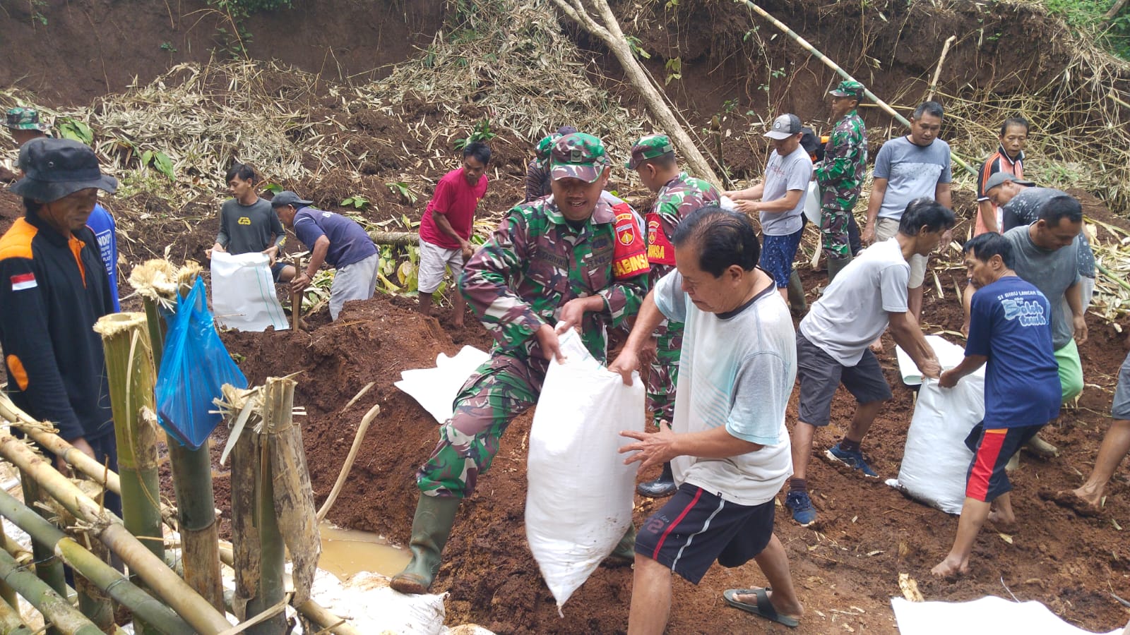 “ Dengan penataan tanggul menggunakan tanah yang di karungi seperti yang kita lakukan saat ini, maka tanah tidak akan mudah longsor ketika turun hujan ”, imbuhnya.