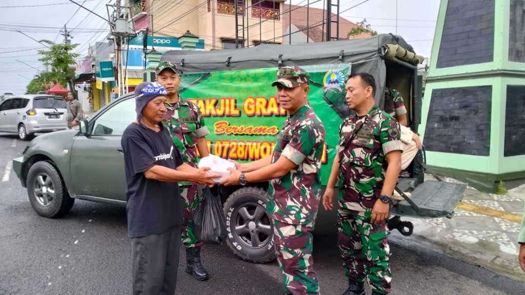 Wonogiri – Prajurit Kodim 0728/Wonogiri yang dipimpin Kasdim Mayor Inf Iman Maulana Sirod, bersama ibu-ibu Persit KCK Cabang XLIX berbagi takjil buka puasa kepada masyarakat yang melintas di jln. Jenderal Sudirman, tepatnya di depan Makodim.
