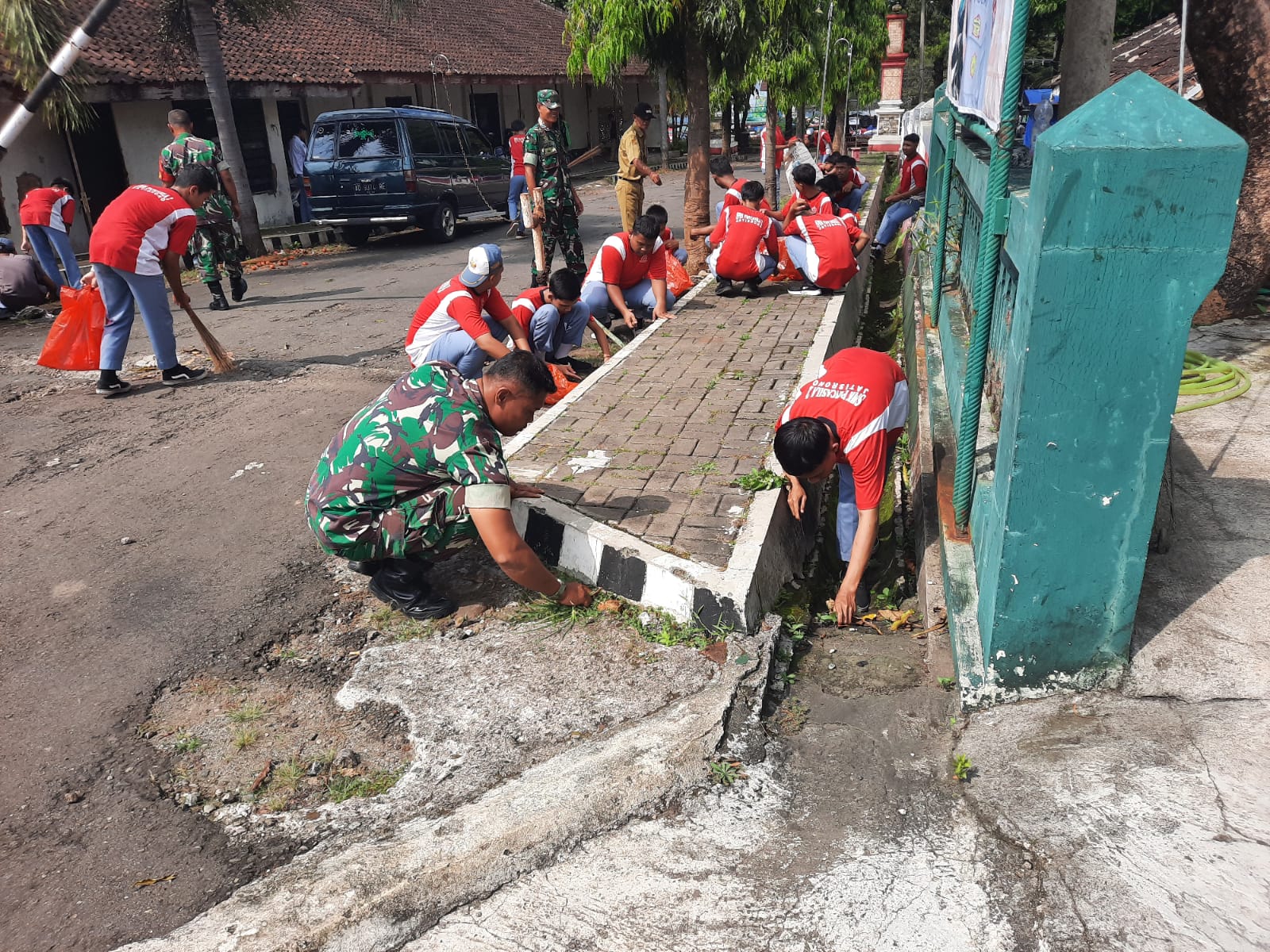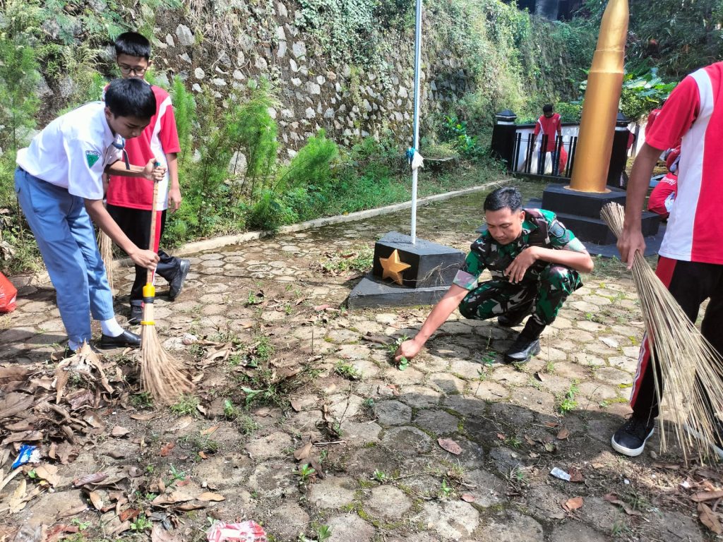 Saat melaksanakan gotong royong, terlihat para siswa dengan penuh semangat bersama anggota TNI saling bahu membahu membersihkan lingkungan.