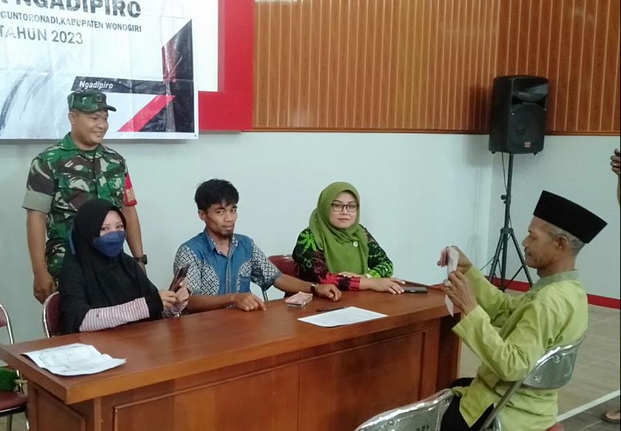 Wonogiri – Babinsa Koramil 04/Nguntoronadi Kodim 0738/Wonogiri bersama perangkat desa melaksanakan pengawalan dan pendampingan Penyaluran Bantuan Langsung Tunai Dana Desa (BLT- DD) senilai @300.000 per KPM kepada warga yang kurang mampu di Desa Ngadipiro Kecamatan Nguntoronadi Kabupaten Wonogiri. Sabtu (10/06/2023).
