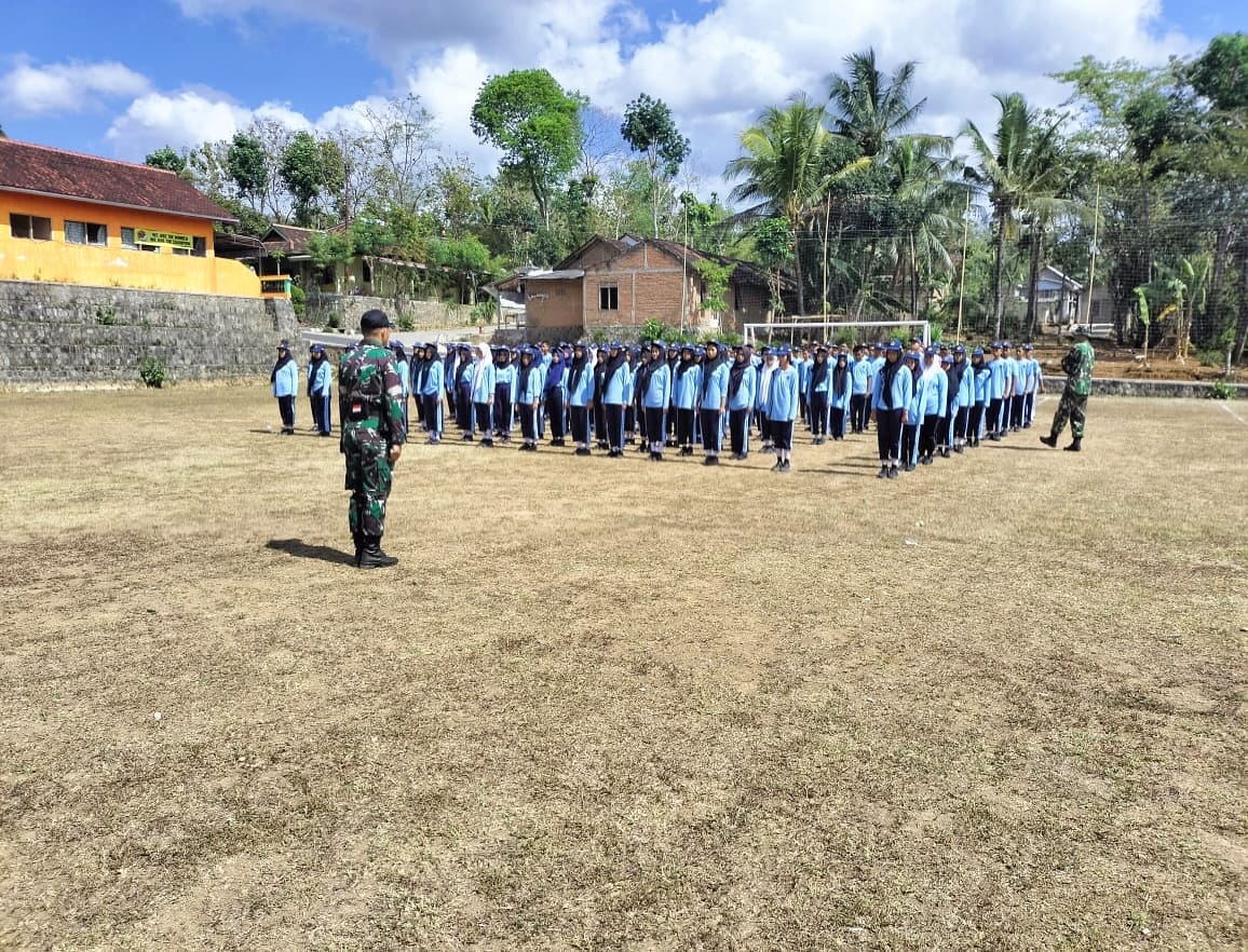 Wonogiri – Bukan hanya membina desa, Anggota Koramil 19/Purwantoro Kodim 0728/Wonogiri Serma Jainul Bersama Sertu Winarto, juga melaksanakan kegiatan Binaan Ketahanan wilayah (Bintahwil) dengan cara memberikan Pelatihan Peraturan Baris Berbaris (PBB), kepada Siswa/siswi SMP N 4 Purwantoro, Jumat (17/10/2025).
